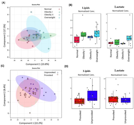 (A) PLS-DA according to the BMI (accuracy 53%, R2 0.265, and Q2 -0.05) (C). PLS-DA between provoked or unprovoked known risks (accuracy 0.253, and Q2 0.062) (B–D) Relative metabolite levels (shown as Normalized Conc. and measured as peak intensities) by VIP—lactate (δ 1.32–1.34) and lipids (δ 0.88–1.31) were responsible for class separation for obesity I and overweight groups, and for provoked and unprovoked groups, respectively. However, only spectral data at δ 0.90 presented statistically significant differences (p < 0.05) between the conditions. These regions correspond to lipids. The black dots represent the metabolite levels in all samples and the yellow diamond represents the average value. In red are thrombosis patients with normal BMI; in green, patients with obesity I; in dark blue, patients with obesity II; in light blue, overweight patients. Provoked are in red and unprovoked are in blue.