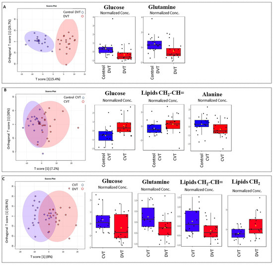This analysis showed a sample clustering for DVT and CVT vs. controls (Figure 3A,B, respectively). The VIP created from the models’ showed alterations in glucose and glutamine for the DVT group (Figure 3A), and in glucose, alanine, and lipids for the CVT group (Figure 3B). When comparing the DVT subgroups against the CVT group, all metabolites mentioned were also found to be important, except for alanine (Figure 3C). The VIP scores for each created model are shown in Table A4.