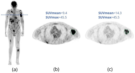 - Vanderhoek, M.; Perlman, S.; Jeraj, R. Impact of the Definition of Peak Standardized Uptake Value on Quantification of Treatment Response. J. Nucl. Med. 2012, 53, 4–11. [Google Scholar] [CrossRef]