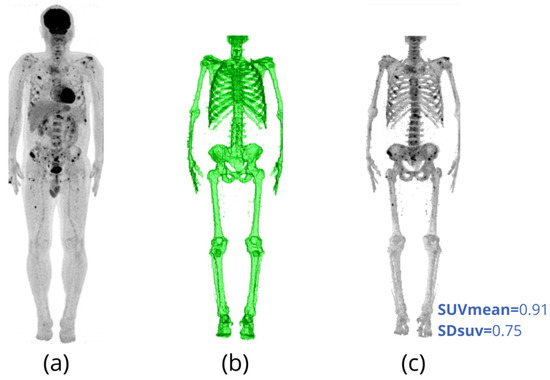 (a) Maximum intensity projection (MIP) image of the follow-up FDG-PET/CT of a 58-year-old male patient with multiple myeloma and mild bone involvement. (b) Bone segmentation mask obtained from CT images of the FDG-PET/CT shown in (a). The skull is excluded because of the intense overlap of cerebral FDG uptake on the cranium [34,37]. (c) MIP of FDG-PET images after bone segmentation using CT. Note that CT segmentation of the bone allows reproducible calculation of the mean SUV (SUVmean) and its respective standard deviation (SDsuv) exclusive for bone and bone marrow tissues of the entire skeleton (except the skull). For this patient, the skeletal SUVmean is 0.91, and its Sdsuv is 0.75.