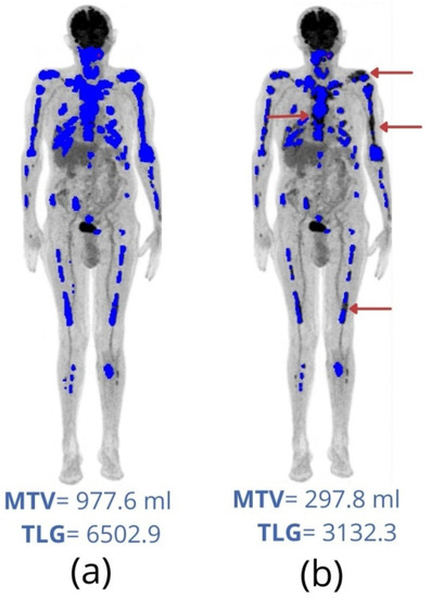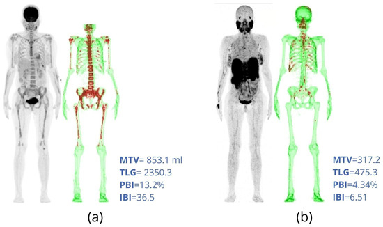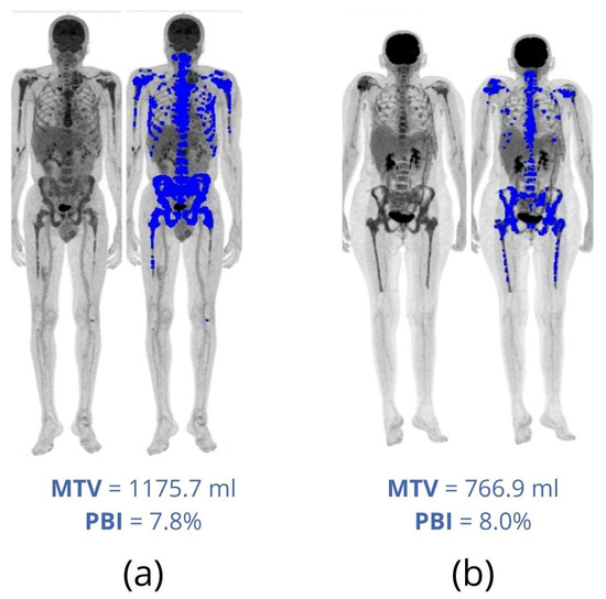 PBI and IBI were proposed by Takahashi et al. [37] to quantify the total bone and bone marrow involvement in MM patients. A total segmentation of FDG uptake in bone tissue is needed to calculate PBI and IBI. For that, the authors used the Hounsfield scale of CT images to segment bone and bone marrow on the co-registered PET. After this step, PBI is calculated as the percentage of the total skeletal volume whose FDG uptake is higher than that of the liver, that is, the percentage of the total skeletal volume that is hypermetabolic. PBI is similar to an MTV normalized by the total skeletal volume of each patient. This normalization makes PBI less dependent on the patient’s height and gender. Patients with different sizes and equivalent MTVs do not have the same percentage of bone volume involved by the disease or vice versa (Figure 4).