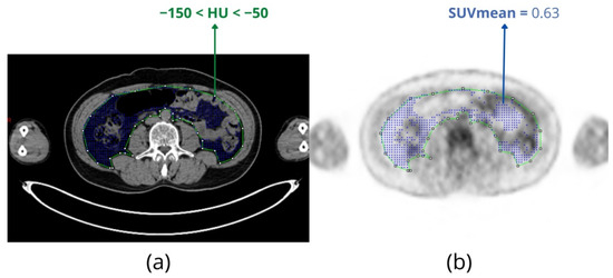 (a) A manual ROI (green line) was drawn on a CT axial slice at the level of L3 to enclose the visceral content. A threshold of −150 < HU < −50 was applied to segment the visceral adipose tissue (VAT), represented by the blue dots. (b) Anatomic region of VAT was then defined in the co-registered FDG-PET. SUV mean was calculated as the arithmetic mean of the SUVs of each pixel of segmented tissue corresponding to the blue dots.