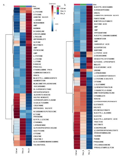 Heatmaps showing the effect of carvacrol on X. perforans. Panels (a,b) show hierarchical clustering of changes in metabolites in the time series in response to carvacrol treatment for the top 50 metabolites. Treatments include untreated wild type (ctrl-wt), samples at 1 h after treatment with carvacrol (One_h), and samples at 6 h after treatment with carvacrol (Six_h). Each treatment was replicated four times. A pooled sample from all four replicates for each treatment was included as a fifth replicate. The average intensities for the five replicates in each treatment are shown. The side bar represents the graduation in intensities, with 1 and −1 representing the highest and lowest intensity or concentration of metabolites, respectively, in both panels. See Supplementary Figure S3xi,xii for changes in all annotated metabolites in response to carvacrol treatment.