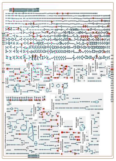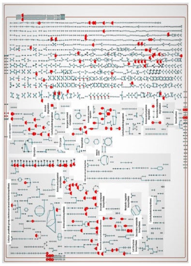 About 217 metabolic pathways are annotated for the reference genome of the X. perforans Xp91-118 on the BioCyc website (www.biocyc.org, accessed on 18 May 2020–30 July 2021). The annotated metabolites in this study (Supplementary Tables S3 and S4) were used to carry out metabolic pathway analyses in BioCyc. Out of the 81 and 86 annotated metabolites in the positive and negative ion modes, respectively, the BioCyc metabolic pathway analyses pipeline only recognized 34 metabolites in each ion mode for X perforans. This resulted in the identification of 18 pathways for metabolites in the positive ion mode and 48 pathways for metabolites in the negative ion mode. Nine of the identified pathways were common in both the positive and negative ion mode, indicating strong evidence that carvacrol affected these pathways. These nine pathways included L-arginine biosynthesis I (via L-ornithine), L-cysteine biosynthesis VI (from L-methionine), L-histidine degradation II, L-lysine biosynthesis I, L-tryptophan degradation I (via anthranilate), pyrimidine nucleobase salvage I, superpathway of L-isoleucine biosynthesis I, superpathway of pyrimidine deoxyribonucleotides de novo biosynthesis, and the taurine degradation IV pathway. The cellular overview of the 34 annotated metabolites overlaid on Xp91-118 metabolic pathways is shown in Figure 2 and Figure 3, respectively, for metabolites in both the positive and negative ion modes.