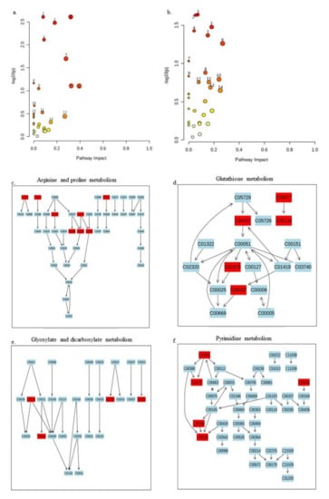 Simulated pathway analyses of significant metabolites in this study against pathways of Pseudomonas putida KT2440. The strength of the impact of the analyzed metabolites is indicated in red and yellow. A deep red color indicates that many metabolites with significant changes as a result of carvacrol application are found in the pathway, and this decreases to a different shade of red, yellow, and white (no metabolite in the pathway). The pathways that have more than one annotated metabolite in this study are labeled from 1–14 in both panels. Panel (a) shows pathways of positive ion mode metabolites. 1 = arginine and proline metabolism, 2 = glutathione metabolism, 3 = aminoacyl tRNA biosynthesis, 4 = pyrimidine metabolism, 5 = glycine, serine, threonine metabolism, 6 = cyanoamino metabolism, 7 = arginine metablosim, 8 = cysteine and methionine metabolism, 9 = sulfur metabolism, 10 = glyoxylate and dicarboxylate metabolism, 11 = lysine degradation, 12 = pantothenate and CoA biosynthesis, 13 = alanine, aspartate, and glutamate metabolism, 14 = methane metabolism). Panel (b) shows pathways of negative ion mode metabolites 1 = glyoxylate and dicarboxylate metabolism, 2 = pyrimidine metabolism 3 = aminoacyl tRNA biosynthesis 4 = sulfur metabolism, 5 = pantothenate and CoA biosynthesis, 6 = alanine, aspartate and glutamate metabolism, 7 = beta-alanine metabolism, 8 = purine metabolism, 9 = cyanoamino acid metabolism, 10 = arginine biosynthesis, 11 = lysine degradation, 12 = citrate (TCA) cycle, 13 = histidine metabolism, 14 = cysteine and methionine metabolism. Panels (c,d) shows the top two identified pathways for positive ion mode metabolites, Arginine and proline metabolism, and glutathione metabolism pathways. The metabolites in this study that are found in each pathway are colored in red (arginine and proline metabolism: C00300: Creatine, C00791: Creatinine, C02714: N-Acetylputrescine, C03771: 2-Oxoarginine, C00077: L-Ornithine, C00436: N-Carbamoylputrescine, C00134: Putrescine, C00149: Malate; glutathione metabolism: C00077: L-Ornithine; C00124: Putrescine; C00027: Glycine; C01879: 5-Oxoproline; C00097: L-Cysteine). Panels (e,f) similarly show the top two pathways for annotated metabolites in the negative ion mode in this study. The metabolites in this study that are found in each pathway are colored in red (glyoxylate and dicarboxylate metabolism: C00149: (S)-Malate, C00065: L-Serine, C00064: L-Glutamine, C00042: succinate; pyrimidine metabolism: C00055: CMP, C00475: Cytidine; C00064: L-Glutamine; C00299: Uridine; C00106: Uracil). Metabolites in the other identified pathways are shown in Supplementary Figure S2i.