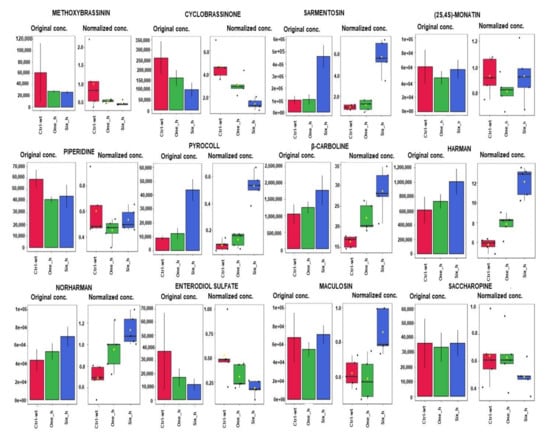 Data from positive and negative ion modes were separately subjected to statistical analysis. All data were normalized to the sum of metabolites for each sample prior to analysis. MZmine v. 2 [160] (http://mzmine.github.io/, accessed on 18 May 2020–30 July 2021) was used to identify features, deisotopes, and to align features and perform gap filling to fill in any features that may have been missed in the first alignment algorithm. All adducts and complexes were identified and removed from the data set. The data were searched against the SECIM internal retention time metabolite library of 1100 compounds for identification. Subsequent searches against HMDB, METLIN, and KEGG were carried out manually.