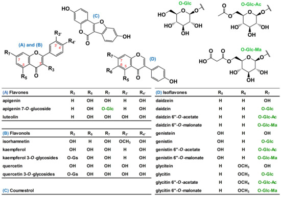 Apigenin, apigenin 7-O-glucoside, daidzein, daidzin, daidzin 6″-O-acetate, daidzin 6″-O-malonate, genistein, genistin, genistin 6″-O-acetate, genistin 6″-O-malonate, glycitein, glycitin, glycitin 6″-O-acetate, and glycitin 6″-O-malonate were purchased from Fujifilm Wako Pure Chemical Industries, Ltd. (Osaka, Japan). Coumestrol, dimethyl sulfoxide (DMSO), kaempferol, kaempferol 3-O-glucoside (astragalin), isoquercitrin, isorhamnetin, luteolin, quercetin, and rutin were purchased from Sigma-Aldrich Co., LLC (St. Louis, MO, USA). The purities of the authentic compounds are listed in Table S1. Two quercetin diglycosides, two quercetin triglycosides, two kaempferol diglycosides, and three kaempferol triglycosides were purified from SLs. Mass-grade formic acid, acetonitrile, methanol, and water were purchased from Thermo Fisher Scientific Inc. (Waltham, MA, USA). Other chemicals used were of American Chemical Society grade or higher.