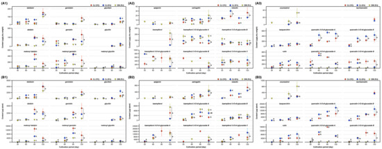 The OPLS regression model for discriminating the difference by cultivation days was established, and the score plot indicated that metabolome differences can be explained by days (left to right) (Figure 4A1). The values of R2X, R2Y, and Q2 of the OPLS regression model were 0.81, 0.78, and 0.64, respectively, indicating relatively suitable fitness (Table S5) [34]. The established model was considered reliable according to the cross-validation with a 100-permutation test. Green R2- and blue Q2-values to the left were lower than the original points to the right, and the regression line of the Q2-points intersected the vertical axis below zero (−0.708) (Figure 4A2). In the S-plot, p of x-axis and p (corr) of y-axis represent a contribution (covariance) of the compounds to the variance of the observations and correlation between samples and the reliability of the results. The metabolites within our criteria of |p| ≥ 0.05 and |p(corr)| ≥ 0.5 in the S-plot were highlighted (Figure 4A3), and the corresponding compounds were depicted in the same color in the variable importance projection (VIP) plot (Figure 4A4). The highlighted red dots in the S-plot indicate the metabolites that increased during the cultivation days. Five isoflavones were listed as important metabolites to discriminate the cultivation days (Table 3 and Table S6).