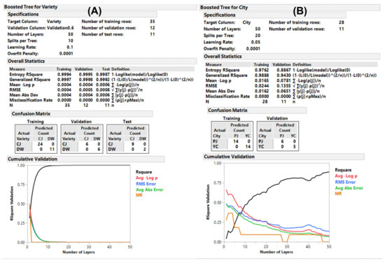 The organized data set used in the aforementioned OPLS and OPLS-DA was randomly divided into three sub-data sets (training, validation, and test), and the predictions were computed using neural (NU), bootstrap forest (BF), and boosted tree (BT) models using JMP 13 pro (SAS Institute Inc., Cary, NC, USA). The classes to be discriminated were varieties (CJ and DW), days (30, 60, 90, and 120), and cities (PJ and YC). The models established using NU exhibited suitable fitness (generalized R2 ranged from 0.94 to 0.99) in the three sub-data sets with multiple layers of hidden computation (Table S5D). The fitness of the models established using BF and BT differed by comparison classes. The BF model discriminated multiple components of a class, while the BT model was effective on a two-component class of the data set to be analyzed. Accordingly, the cultivation days were effectively discriminated using the BF model, which was not applicable to the BT model. The classes of variety and city showed lower fitness in the BF model (data not shown) compared to that of BT. The BT model for the variety displayed excellent fitness (>0.99) for all three sub-data sets (Figure 5 and Table S5D). The comparison of cities using the BT model was not applicable to the test set because of inadequate effective data; therefore, the model was established without it. The key compounds obtained using the BF and BT methods are listed in Table S8 using the criteria (sum of contributing portion of G2 > 90% in the order of the portion). None were obtained using NU because of the hidden node decision feature. Compared to the OPLS and OPLS-DA outputs of the key compounds, the other ML methods included slightly different compounds. However, we observed that there were similarities in the compounds listed for the supervised ML methods; therefore, we created combined criteria for the key compounds derived from the discriminative classes.