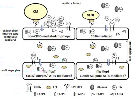- Bharadwaj, K.G.; Hiyama, Y.; Hu, Y.; Huggins, L.A.; Ramakrishnan, R.; Abumrad, N.A.; Shulman, G.I.; Blaner, W.S.; Goldberg, I.J. Chylomicron- and VLDL-derived lipids enter the heart through different pathways: In vivo evidence for receptor- and non-receptor-mediated fatty acid uptake. J. Biol. Chem. 2010, 285, 37976–37986. [Google Scholar] [CrossRef] [PubMed]