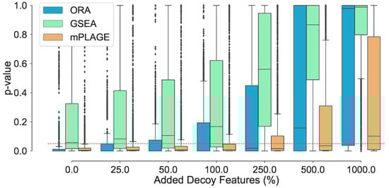 Adding nonchanging decoy features to the seven known changing pathways . The percentage of decoy features represents the number of additional noisy features added to a pathway as a percentage of the original number of features in that pathway. The boxplots show the spread of the p-values calculated from the pathways, including the median (solid horizontal line). The red dashed line indicates a p-value threshold of 0.05. The results show that increasing noise levels generally produces higher p-values, making it harder to detect significantly changing pathways. mPLAGE is more robust compared to other methods in returning lower p-values in the presence of noise.