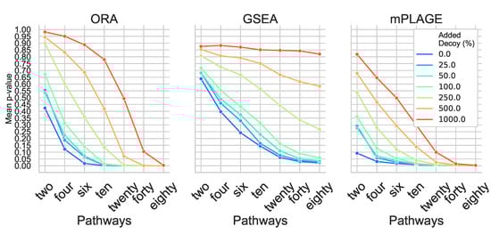 Mean p-values from overrepresentation analysis (ORA), gene set enrichment analysis (GSEA), and pathway level analysis of gene expression for metabolomics (mPLAGE) calculated for each significantly changing synthetic pathway at different levels of decoy features added. Across all levels of added decoy features, it is easier to identify larger pathways as significantly changing than smaller pathways. mPLAGE generally returns lower p-values than ORA and GSEA.