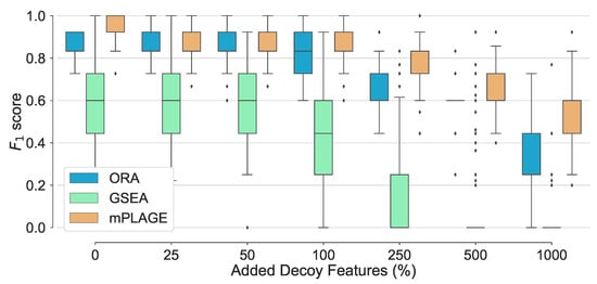 For all pathways across all levels of added decoy features, mPLAGE returns lower p-values compared to ORA and GSEA, which means that more significantly changing metabolite sets can be detected. This is similar to findings reported by Evangelou et al. [] that compare methods for competitive tests for pathway analysis of gene sets and found that the power of all tested methods increased with the size of the pathway. Finally, score performance was evaluated. This summarises overall retrieval ability, taking into account the number of true positives, false positives, and false negatives of the methods being tested. Using this metric, it could be seen that the performance of ORA and mPLAGE were roughly similar using 0–100% levels of non-changing features (Figure 3). At higher levels of added decoy features of 250%, 500%, and 1000%, the scores of mPLAGE were consistently higher than ORA and GSEA. These results showed that a greater number of true positive pathways could be identified with mPLAGE than with ORA or GSEA. GSEA performed worst among the three methods tested, particularly showing its sensitivity to nonchanging or decoy features.