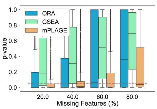 Resulting p-values from removing features from significantly changing pathways. The percentage of features randomly removed from the pathways increases from 20% to 80% and ORA, GSEA, and mPLAGE are compared. The red dashed line indicates a p-value threshold of 0.05. The results show that mPLAGE performs better, returning lower p-values compared to the alternatives, even in the presence of a large number of missing features.