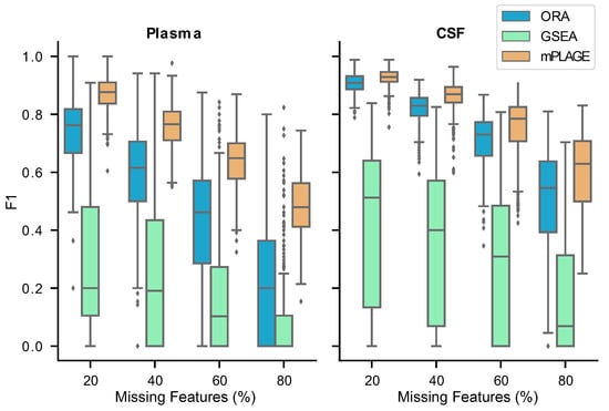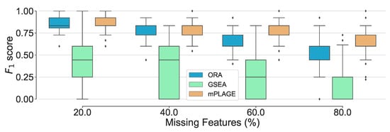 Overall performance of the different pathway ranking methods with missing features. Distribution of the scores for each method under an increasing proportion of missing features (20% to 80%) is shown. The results show that mPLAGE performs better, returning greater -scores at higher proportions of missing features.