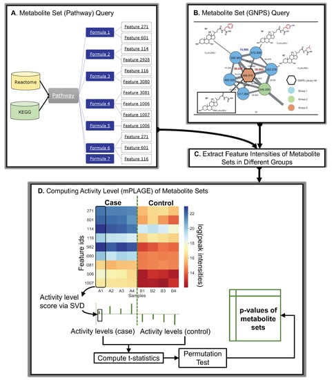 In recent years, enrichment analysis algorithms, originally developed for analysing large collections of genes or transcripts, have been adapted to metabolomics. These methods were traditionally used to test gene expression data for functions or processes that are overrepresented (i.e., enriched) with regard to functional gene sets, pathways, and networks. Considering differentially expressed (DE) gene sets, two of the most commonly used types of gene enrichment techniques are overrepresentation analysis (ORA) and functional class scoring (FCS). ORA approaches rely on testing for the presence or absence of significantly changing genes in a pathway, using statistical significance tests. FCS methods, which include gene set enrichment analysis (GSEA) [] use statistical approaches to identify gene sets that are significantly enriched or depleted in the pathway. FCS improves upon ORA by eliminating the need to preselect significantly changing genes, as well as taking into account how groups of genes can be coexpressed together (instead of assuming they are independent, as in ORA). One such FCS method is pathway level analysis of gene expression (PLAGE) [], which performs singular value decomposition (SVD) to compute an activity value from expression data in a sample. This has advantages over other methods in that it is computationally simple while returning high performance in both sensitivity and specificity []. In addition, the PLAGE method does not discriminate between upward or downward activity, meaning that both increases and decreases in gene expression contribute to the activity of a pathway.