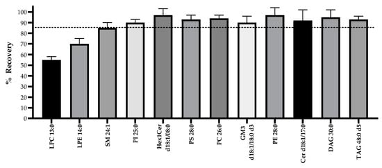Recovery of 12 lipid standards from different classes when using a modified MTBE/methanol 2-phase extraction method. Error bars represent standard deviation (n = 6). The dotted line indicates the average recovery (88%).