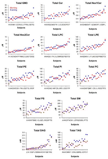 Individual differences in concentrations of human milk lipids. Lipid concentrations in morning (red) and evening (blue) milk samples are shown for 20 women. The data in each plot are ordered from left to right by the average concentration values of morning and evening samples in each participant.