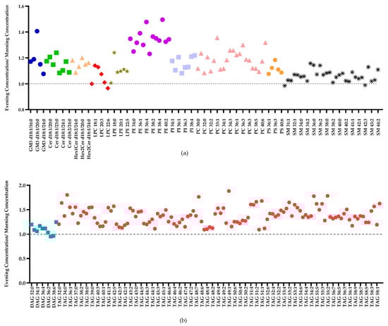 Lipid synthesis, storage, and transport are regulated by the circadian (“around a day”) system []. Given that rest-activity, feeding, and the plasma lipidome are diurnally regulated by the circadian clock and environmental factors [], the composition of HM may likewise vary by time of day. Several studies have investigated diurnal variation of total fat content in HM using different methods of collection including pre-/post-feed expressed samples [,,], total milk from a fully expressed breast [,,,,], and demand feeding versus scheduled samples. Despite different sampling approaches, it has been consistently observed that total milk fat exhibits a 24-h rhythm, with most studies finding higher concentrations in the evening compared with other times of day []. Diurnal variation has also been observed for other milk components, including amino acids, minerals, and melatonin [,,,]. These studies suggest that the circadian system regulates the composition of milk and may serve as an important source of intra-individual variance. While prior studies have reported diurnal variation of total TAG levels, cholesterol, and cortisol in milk [], there is almost no information on diurnal regulation of low abundant lipids, e.g., sphingolipids or phospholipids.