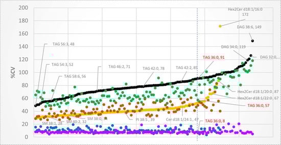 There are several possible sources of biological variation of lipids in our study. In addition to differences that may arise due to individual variation in genetics and physiology, lipids in HM are affected by lactation stage, time elapsed since last feed, the extent of breast emptying, hormonal changes [,], and maternal diet. Milk composition also varies during a feed, with foremilk having more water and less fat compared with hindmilk. Some studies have shown that the BMI of the mother is associated with the fat concentration of milk in both well-nourished and under-nourished populations [,]. In the present study, we attempted to minimize these sources of variance by recruiting women who were healthy and at a similar stage of lactation, and by asking participants to fully express one breast (i.e., pooling foremilk and hindmilk). The biological variation in our study is likely representative of healthy Singaporean women, but additional studies are needed to understand better the sources of biological variation of lipid species in breastmilk.