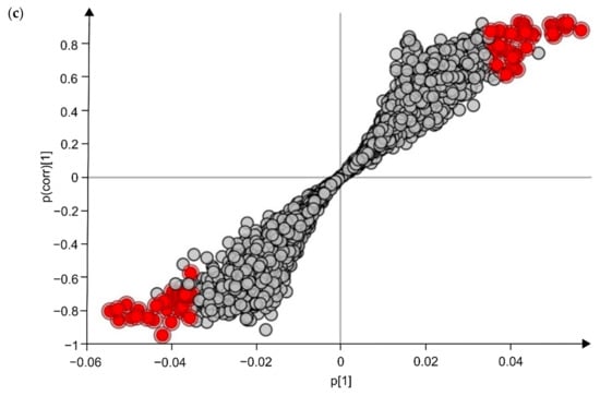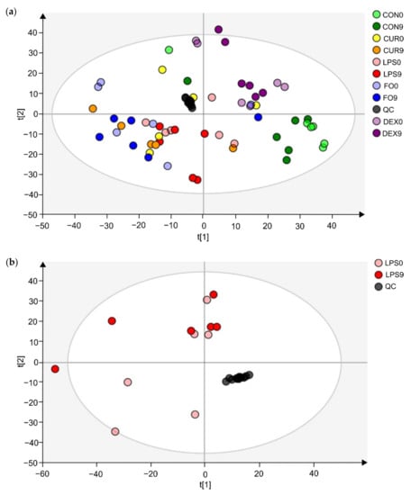 Establishment of the metabolic fingerprints was achieved using Compound Discoverer 3.0 (Thermo Fisher Scientific, San Jose, CA, USA) for positive and negative ionization mode simultaneously, with the following parameter settings: retention time tolerance 0.25 min, mass tolerance 6 ppm, m/z scan range 53.4–800 Da, retention time range 0.5–16 min, minimum peak intensity threshold 500,000 a.u., and S/N threshold 10. QC-samples and the total ion current (TIC) were used for ion abundance normalization adjust for both sample- and feature-specific analytical bias []. Metabolites that were significantly altered upon APR were selected by multivariate statistical analysis, using SIMCATM 15 software (Umetrics AB, Umea, Sweden), for which data were log-transformed to induce normality and pareto-scaled to reduce the relative importance of larger values. Multivariate statistical analysis was initiated by unsupervised principal component analysis (PCA-X) to visualize potential outliers and natural clustering. Subsequently, to reveal significant differences between LPS day 0 (LPS0) and LPS day 9 (LPS9) samples, orthogonal partial least squares discriminant analysis (OPLS-DA) models were constructed. Model-validity was verified based on the quality parameters R2X and Q2Y, cross-validated ANOVA (CV-ANOVA) (p-value < 0.05) and permutation testing (n = 100) []. APR-specific metabolites were selected based on the variable importance in projection (VIP > 1), Jack-knifed confidence interval (not across 0) and the S-plot descriptors (covariance and correlation). Finally, a t-test analysis within LPS group (day 0 vs. day 9) and CON group (day 0 vs. day 9) was performed to select the potential Gram-negative bacterial endotoxin markers.