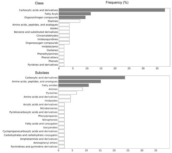 The defined markers (n = 37) were tentatively identified by taking into account retention time, accurate mass (MS1) and precursor-specific fragmentation data (MS2) []. The Gram-negative bacterial endotoxin biomarkers and associated chemical data (including proposed chemical formula and structures, as obtained by SIRIUS software) are presented in Table 1 and Table 2. In addition, chemical structures and identities (IUPAC-name and PubChem ID), as well as chemical taxonomy, are presented in Supplementary Table S1. The class and subclass frequency of the markers, derived from Table 1 and Supplementary Table S1, are shown in Figure 2. Carboxylic acids and derivatives, fatty acyls, and organonitrogen compounds were the top-ranked classes, while carboxylic acid derivatives—amino acids, peptides, and analogues—and fatty amides were the most frequently represented subclasses.