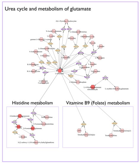 - Gao, J.; Tarcea, V.G.; Karnovsky, A.; Mirel, B.R.; Weymouth, T.E.; Beecher, C.W.; Cavalcoli, J.D.; Athey, B.D.; Omenn, G.S.; Burant, C.F.; et al. Metscape: A Cytoscape plug-in for visualizing and interpreting metabolomic data in the context of human metabolic networks. Bioinformatics 2010, 26, 971–973. [Google Scholar] [CrossRef]