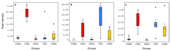 Effect of LPS, DEX, FO, and CUR on selected biomarkers, highly representative for the carboxylic acid derivatives subclass ((a), ID23), fatty amides subclass ((b), ID17), and steroid hormone biosynthesis and metabolism ((c), ID31). The different letters indicate a significant difference between groups (p-value < 0.05).