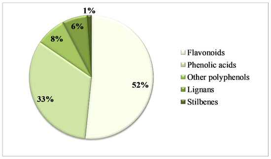 The PCs identified in this study belonged to different chemical classes that were listed by decreasing number of occurrences in the extracts (Figure 1). Regardless of the RB types and conditions of extraction, the flavonoids were the most representative class of PCs with 52% of occurrences, followed by the phenolic acids (33%), other polyphenols (8%), lignans (6%) and stilbenes (1%).