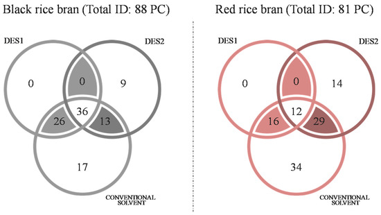 To better visualize common and unique PCs within the different extracts, PCs were displayed under the form of a Venn diagram (Figure 2). When looking at PCs in common in the three types of extracts either for black RB or for red RB, 36 common PCs out of 88 were identified in black RB versus 12 only out of 81 in red RB. This limited common pool of PCs underlines the specificity of extraction of each type of extract.