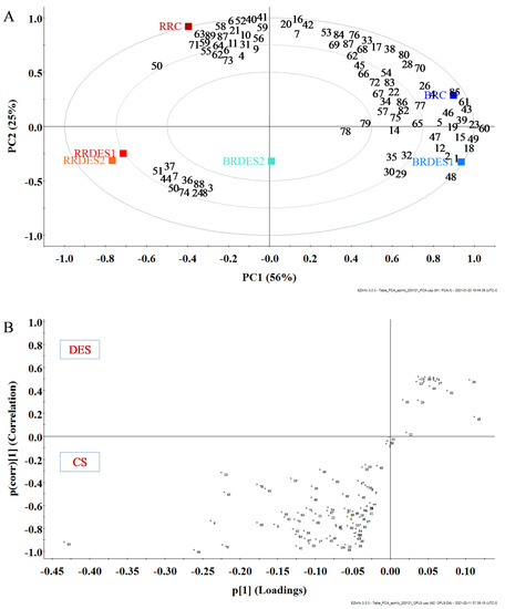 (A) Principal components analysis of PCs of pigmented RB extracted with conventional and deep eutectic solvents (DES) methods; (B) S-plots from Orthogonal Partial Least Squares Discriminant Analysis (OPLS-DA) modeling of conventional solvent (CS) extracts versus DES extracts. The loadings are represented by the respective numbers to each putative phenolic compound described in Table 2. Abbreviations: red rice conventional (RRC), red rice DES1 (RRDES1), red rice DES2 (RRDES2), black rice conventional (BRC), black rice DES1 (BRDES1), black rice DES2 (BRDES2).