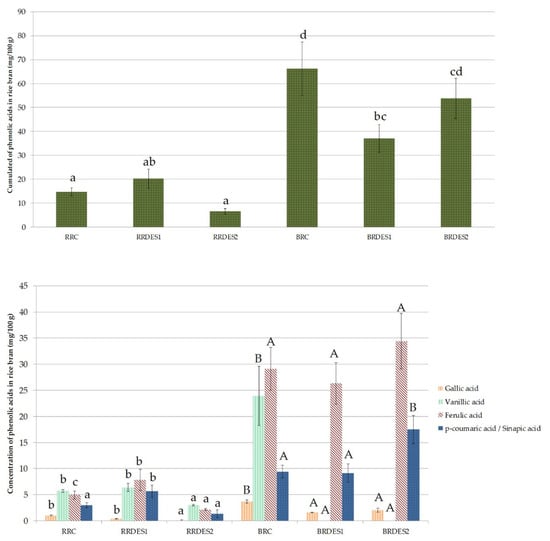Concentration (mg/100 g) of RB extracts in five typical phenolic acids found in cereals. (Figure on the top) Cumulated concentration of the five phenolic acids quantified in this study. Different lowercase letters between extracts indicate significant differences in cumulated concentration of the amount of the five phenolic acids (p < 0.05). An extract with "ab" means that this concentration doesn’t have a significant statistical difference with the compared concentrations which have the same letter (a and b). (Figure at the bottom) Quantification of gallic, vanillic, ferulic and p-coumaric/sinapic acids in RB extracts. Different lowercase letters indicate significant differences between red RB extracts for a given phenolic acid. Different uppercase letters: indicate significant differences between black RB extracts for a given phenolic acid (p < 0.05). Abbreviations: red rice conventional (RRC), red rice DES1 (RRDES1), red rice DES2 (RRDES2), black rice conventional (BRC), black rice DES1 (BRDES1), black rice DES2 (BRDES2).
