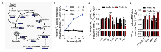 Itaconate influences glutamine metabolism. (a) Schematic depicting carbon incorporation into tricarboxylic acid (TCA) cycle intermediates from [U-13C5]glutamine (blue). Open circles depict 12C, closed circles 13C carbon. (b) Labeled metabolite level (depicted as abundance times mole percent enrichment (MPE)) from [U-13C5]glutamine in Huh7 cells cultured in the presence of 2 mM itaconate for 4 h. (c) 13C incorporation (mole percent enrichment, MPE) into metabolites from [U-13C5]glutamine in Huh7 cells cultured for 48 h. (d) 13C incorporation into succinate from [U-13C5]glutamine in diverse cell types in the presence of 0 mM or 2 mM itaconate after 48 h. Data are depicted as mean ± s.e.m. obtained from 3 cellular replicates. Students t-test with no adjustment for multiple comparisons and * p < 0.05, ** p < 0.01, *** p < 0.001, # p < 0.0001.