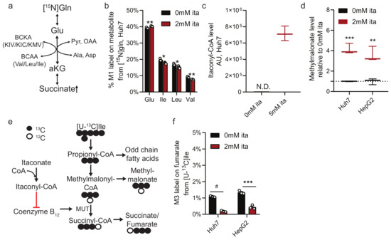 Itaconate influences methylmalonyl-coenzyme A (CoA) mutase (MUT) dependent BCAA metabolism. (a) Schematic depicting nitrogen exchange from [α-15N]glutamate on branched-chain amino acids (BCAA) and branched-chain keto acids (BCKA). (b) Labeling on amino acids from [α-15N]glutamine in Huh7 cells cultured for 48 h in the presence of 2 mM itaconate. (c) Itaconyl-CoA levels depicted as ion counts (m/z = 880.1379) in Huh7 cells. N.D. not detectable. (d) Methylmalonate levels in Huh7 or HepG2 cells exposed to 2 mM itaconate for 48 h compared to 0 mM itaconate (dotted line). (e) Schematic depicting methylmalonyl-CoA mutase (MUT) dependent BCAA catabolism. Open circles depict 12C, closed circles 13C carbons from [U-13C6]isoleucine tracer. (f) M3 label on fumarate from [U-13C6]isoleucine in Huh7 and HepG2 cells exposed to 2 mM itaconate for 48 h. Data are depicted as box and whiskers (c,d) or mean ± s.e.m. (b,f) obtained from 3 cellular replicates. Students t-test with no adjustment for multiple comparisons and * p < 0.05, ** p < 0.01, *** p < 0.001, # p < 0.0001.