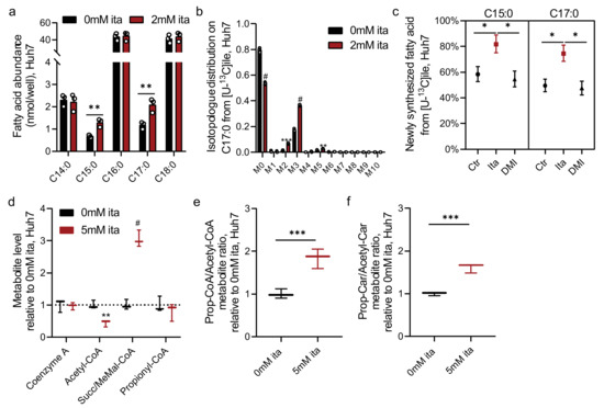 Itaconate alters fatty acid diversity and CoA metabolism. (a) Levels of fatty acids in Huh7 cells cultured for 48 h in the presence of 2 mM ita. (b) Isotopologue distribution on C17:0 from [U-13C6]isoleucine in Huh7 cells after 48 h. (c) Newly synthesized C15:0 and C17:0 from [U-13C6]isoleucine in Huh7 cells exposed to itaconate or dimethyl-itaconate (DMI) for 48 h. (d) Levels of CoA species in Huh7 cells exposed to 5 mM itaconate for 48 h compared to 0 mM itaconate (dotted line). MeMal-CoA; Methylmalonyl-CoA. (e) Propionyl-CoA to acetyl-CoA metabolite ratio in Huh7 cells after 48 h. (f) Propionyl-carnitine to acetyl-carnitine metabolite ratio in Huh7 cells after 48 h. Data are depicted as box and whiskers (d–f), mean ± s.e.m. (a,b) or 95% confidence intervals from ISA model (c) obtained from 3 cellular replicates. Students t-test (a,b,d–f) with no adjustment for multiple comparisons * p < 0.05, ** p < 0.01, *** p < 0.001, # p < 0.0001. Significance was considered as non-overlapping confidence intervals for (c).