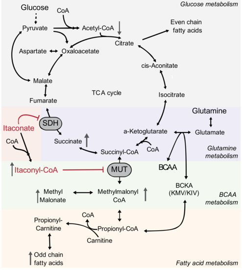 Our metabolic studies indicate a regulatory impact of itaconate on propionate metabolism via inhibition of MUT flux induced by itaconyl-CoA (thereby increasing methylmalonate OCFA levels). MUT activity is coenzyme B12-dependent and, thus, the level of methylmalonate is an indirect measurement of coenzyme B12 levels. MUT catalyzes the reaction from methylmalonyl-CoA into the TCA cycle intermediate succinyl-CoA. Decreased MUT activity limited carbon flux into the TCA cycle and substrate availability for the SDH reaction. Further, propionyl-CoA is an important precursor for OCFAs [32,33,34]. To metabolize excess propionyl-CoA, free carnitine is esterified to generate propionyl-carnitine that is transported into the cytosol for fatty acid synthesis [44]. Thus, itaconate-exposed cells could exhibit imbalances in CoA and carnitine pools to influence other pathways.