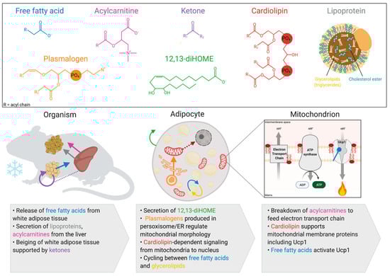 Due to the dissipation of the proton gradient and futile cycles, thermogenesis is energy demanding and has been an area of intense study for body weight control and metabolic health []. The maintenance of elevated energy consumption requires the uptake of glucose, amino acids, and lipids as energy substrates. Numerous lipids have been shown to have increased uptake into brown and beige adipocytes with cold exposure including free fatty acids, acylcarnitines, and lipoprotein complexes []. Beyond their direct role in fueling thermogenesis, lipids are important for their capacity as signaling molecules, components of membranes, and as posttranslational modifications []. These dynamic roles for lipids highlight their molecular complexity and the shift in lipid abundance as a measure of stored energy availability.