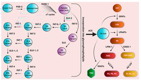 The pathway for polyunsaturated fatty acid biosynthesis and the incorporation of fatty acids into glycerophospholipids in C. elegans. Enzyme names are abbreviated in black over the arrows. POD-2, acetyl-CoA carboxylase; FASN-1, fatty acid synthase; ELO, elongase, FAT-5 ∆9 desaturase; FAT-6/-7, ∆9 desaturases; FAT-2, ∆12 desaturase; FAT-1, omega-3 desaturase; FAT-3, ∆6 desaturase; FAT-4, ∆5 desaturase; ACS; acyl CoA synthetases; GPATs; glycerol-3 phosphate acyl transferases; LPAATs, lysophosphatidic acid acyl transferases; LPIN-1, lipin; CDGS-1, CDP-diacylglycerol synthase; DGATs; diacylglycerol acyl transferases. The metabolites in the pathways are enclosed in bubbles. SA, stearic acid; PA, palmitoleic acid; VA, vaccenic acid; OA, oleic acid; LA, linoleic acid; ALA, alpha linolenic acid; GLA, gamma linolenic acid; DGLA, dihomo gamma linolenic acid; AA, arachidonic acid; STA, stearidonic acid; ETA, eicosatetraenoic acid; EPA, eicosapentaenoic acid; FA-CoA, fatty acids conjugated to CoA; G3P, glucose-3 phosphate; LPA; lysophosphatidic acid; PA, phosphatidic acid; DAG, diacylglycerol; CDP-DAG, cytidine diphosphate diacylglycerol; TAG, triacylglycerols; PC, phosphatidylcholine; PE, phosphatidylethanolamine; PS, phosphatidylserine; PI, phosphatidylinositol; CL, cardiolipin. Adapted from [52].