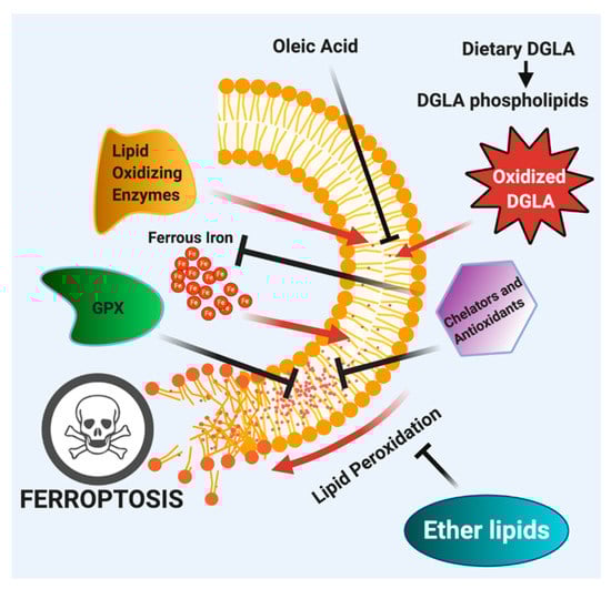 Exogenous DGLA induces ferroptosis by accumulation of lipid peroxides and epoxides of DGLA and further exacerbated by ferrous iron and lipid oxidizing enzymes. This activates lipid repair pathways, including GPXs and can be inhibited by iron chelators and radical trapping antioxidants. Finally, ether lipids play a protective function in DGLA-induced ferroptotic cell death by inhibiting lipid peroxidation. Adapted from [43].