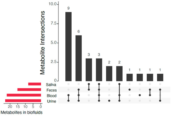 Intersections of biofluids in which the 31 metabolites previously not reported as CSF metabolites in the HMDB have been detected (based on HMDB data).
