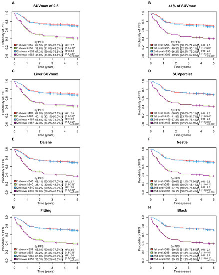 Kaplan-Meier estimates of progression-free survival according to the readers and the eight methods. (A) PFS Figure 2. 5 method; (B) PFS for 41% of SUVmax method; (C) PFS for Liver SUVmax method; (D) PFS for SUVpercist method; (E) PFS for Daisne method; (F) PFS for Nestle method; (G) PFS for Fitting method; (H) PFS for Black method.