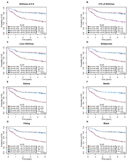 Kaplan–Meier estimates of overall survival according to the readers and the eight methods. (A) OS for SUVmax of 2.5 method; (B) OS for 41% of SUVmax method; (C) OS for Liver SUVmax method; (D) OS for SUVpercist method; (E) OS for Daisne method; (F) OS for Nestle method; (G) OS for Fitting method; (H) OS for Black method.