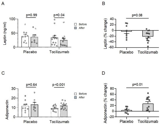 The serum was prepared from blood collected after an overnight fast at V2 and V6. Circulating adipokines were determined in 13 tocilizumab- and 9 placebo-treated subjects (Figure S2). Two participants in the tocilizumab group were excluded because of a lack of training compliance. For some participants, the serum was not available for both analyzed time points. Leptin was determined using a human leptin Mesoscale Discovery (MSD; Rockville, MD, USA) assay K151BYC-2, and the serum adiponectin was measured using MSD assay K151BXC-2.