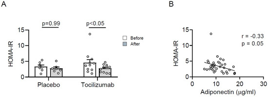 Tocilizumab administration decreases HOMA-IR in people with obesity. HOMA-IR was determined in people with obesity, with or without type 2 diabetes, receiving placebo (n = 7) or tocilizumab administration (n = 11) before (open bars) and after 12 weeks (grey bars) of administration. Data are displayed as absolute values (A) over the 12-week administration period. Values are expressed as mean ± SEM. (B) Scatter plot and correlation coefficient (r) of circulating adiponectin concentration and HOMA-IR before and after 12 weeks of administration in people with obesity, with or without type 2 diabetes, receiving placebo or tocilizumab.
