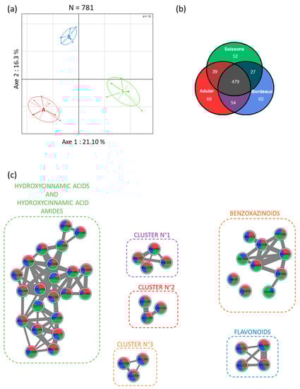 Principal component analysis obtained from LC-HRMS profiles of root extracts of the three wheat genotypes. Secondary metabolomes of wheat roots are displayed following PC1 = 21.1% and PC2 = 16.3% (n = 21 samples; 781 molecular ions) (a). The Venn diagram represents the significantly overproduced wheat metabolite ions according to the wheat genotypes (p ≤ 0.05; a Kruskal-Wallis nonparametric test corrected for false discovery; n=7 replicates) (b). Generation of a molecular network from MS/MS analyses of methanol extract of Adular, Bordeaux and Soissons wheat genotypes. Node identification corresponds to the masses of parent ions [M+H] and the pie charts show the production of metabolites according to the wheat genotypes. In order to enhance visibility, only clusters with more than three nodes were kept on the molecular network (c).
