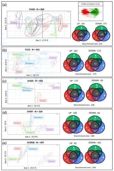 Principal component analysis obtained from LC−HRMS profiles of Pseudomonas strains. The LC-HRMS profiles are those of Pseudomonas protegens CHA0 (a), Pseudomonas kilonensis F113 (b), Pseudomonas koreensis JV222 (c), Pseudomonas chlororaphis JV497 (d) and JV395B (e) cultivated with wheat root extracts. All principal component analyses were associated with Venn diagrams representing proportions of metabolite ions of Pseudomonas significantly over and less produced in the presence of root extracts of Adular (A), Soissons (S) or Bordeaux (B) genotypes against control (p ≤ 0.05; a Wilcoxon nonparametric test corrected for false discovery; n=5 replicates). The principal component analysis obtained from the extracts of CHA0 under the influence of wheat extract at 25 (C1) and 50 µg/mL (C2) highlighted the concentration-dependent effects of the wheat extracts (a). The correlation circle associated with the principal component analysis for the CHA0 strain displays the metabolite ions involved in the separation of samples (a).