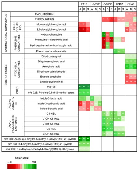 Influence of wheat root extracts on bacterial secondary metabolites involved in plant–bacteria or bacteria-bacteria interactions [28]. Heatmap projections represent Log2 fold changes in relative intensities of metabolites of Pseudomonas strains cultivated with root extracts from different wheat genotypes (Adular: A, Bordeaux: B or Soissons: S) and control. Statistically significant values against control (p ≤ 0.05; a Wilcoxon nonparametric test corrected for false discovery; n=5 replicates) were represented by: *: p ≤ 0.05 or ** p ≤ 0.01. The green color indicates metabolites with a greater intensity in the presence of root extracts, while the red color indicates metabolites with a greater abundance in the absence of root extracts. The white color means that the corresponding metabolite was absent from the bacterial extract.