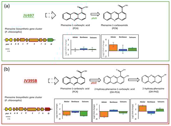 Plant metabolites interfere with the biosynthesis of phenazine-1-carboxylic (PCA) derivatives. The figure displays, for Pseudomonas chlororaphis JV497 (a) and JV395B (b), the phenazine biosynthetic pathway (adapted from Chin-A-Woeng et al. (2003) [29]), the organization of the phenazine biosynthetic operon in Pseudomonas chlororaphis JV497 (a) and JV395B (b), and the relative intensities (Log2 fold changes) of phenazine derivatives of Pseudomonas cultivated in the presence of wheat root extracts compared to the control condition (culture in the absence of root extracts) (n = 5 replicates).