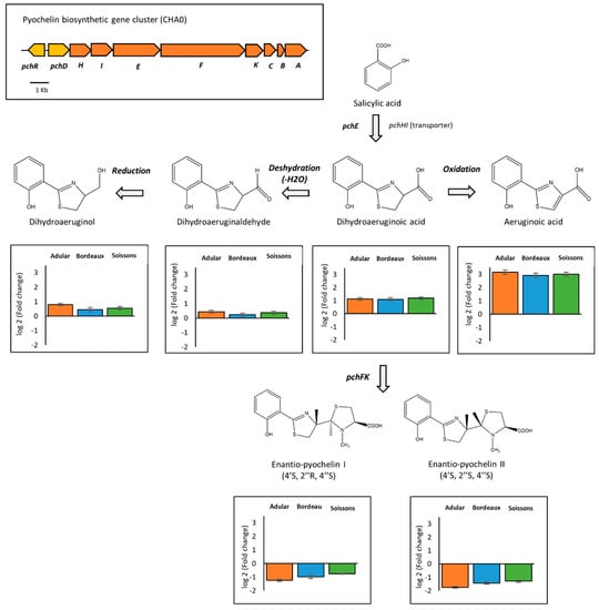 Regarding the biosynthesis pathway of enantio-pyochelins found exclusively in P. protegens CHA0 (Figure 5), the immediate precursor of enantio-pyochelin and its derivatives (i.e., dihydroaeruginoic acid, aeruginoic acid, dihydroaeruginol and dihydroaeruginaldehyde) (Figure S3) were more produced in response to wheat extracts, while both enantio-pyochelins I and II were less produced. Finally, auxin derivatives produced by P. kilonensis F113 and P. koreensis JV222 were also differentially modulated by root extracts. Indole-3-lactic acid was more produced by both strains in response to wheat extracts, whereas indole-3-acetic acid was less accumulated by F113 and not impacted in JV222. Interestingly, the production of indole-3-carboxylic acid and indole-3-lactic acid by JV222 was not impacted in the same way, depending on the wheat genotype used to obtain root extracts. The Adular extract led to an increased amount of indole-3-lactic acid, whereas the Soissons extract triggered the accumulation of indole-3-carboxylic acid (Figure 3).