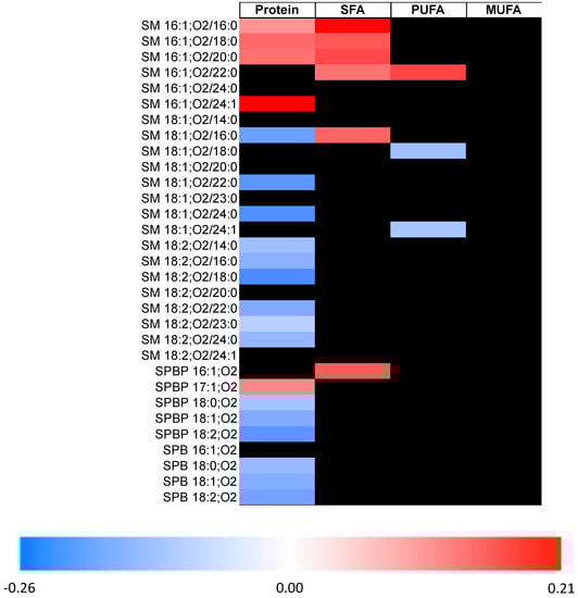 Associations between intakes of protein and different types of fat, and individual sphingolipid concentrations of the SP2 participants (n = 2860). Associations that are not statistically significant (adjusted p > 0.050) after Benjamini‑Hochberg correction are indicated with a black box. We quantified 26 ceramides (Cers), 16 monohexosylceramides (HexCers), 6 dihexosylceramides (Hex2Cers), 22 sphingomyelins (SMs), 5 sphingoid base phosphates (SPBPs), and 4 sphingoid bases (SPBs) for a total of 79 sphingolipid species. The colors are beta coefficients from linear regression analysis representing the change per SD in circulating sphingolipids (log-transformed values) for every 5% of total energy intake increment in nutrient intake. We adjusted for age, sex, energy intake, BMI, alcohol intake, physical activity, cigarette smoking, high-density lipoprotein cholesterol, low-density lipoprotein cholesterol, and triglycerides. We adjusted for age, sex, energy intake, BMI, alcohol intake, physical activity, cigarette smoking, high-density lipoprotein cholesterol, low-density lipoprotein cholesterol, and triglycerides. Additionally, for protein and total fat outcomes, we mutually adjusted them for each other, and for saturated fat, polyunsaturated fat, and monounsaturated fat outcomes, these were mutually adjusted for each other in addition to protein intake. Abbreviations: MUFA, monounsaturated fatty acid, PUFA, polyunsaturated fatty acid, SFA, saturated fatty acid.